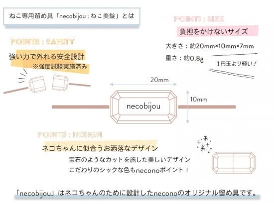 特徴 | ネックレスのようなお洒落なネコ用首輪です。 胸元で輝くシルバー製の鈴はちょっと贅沢な気分にさせてくれます。 安全設計のセイフティーバックル(neconoオリジナル「ねこ美錠」)を使用しています。 |